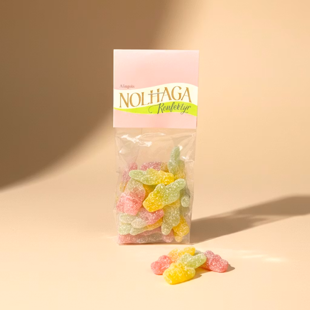 Ingredienser: glukossirap, socker, vatten, nötkött gelatin, syra: citronsyra, äpplesyra, surhetsreglerande medel: natriummalat, naturliga smakämnen, naturlig äppelsmak med andra naturliga smaker, färger: koncentrat av spirulina och safflor, antocyanin, gurkmeja, naturlig citronsmak med andra naturliga smaker. VETEstärkelse. Glukossirap. EU ursprung