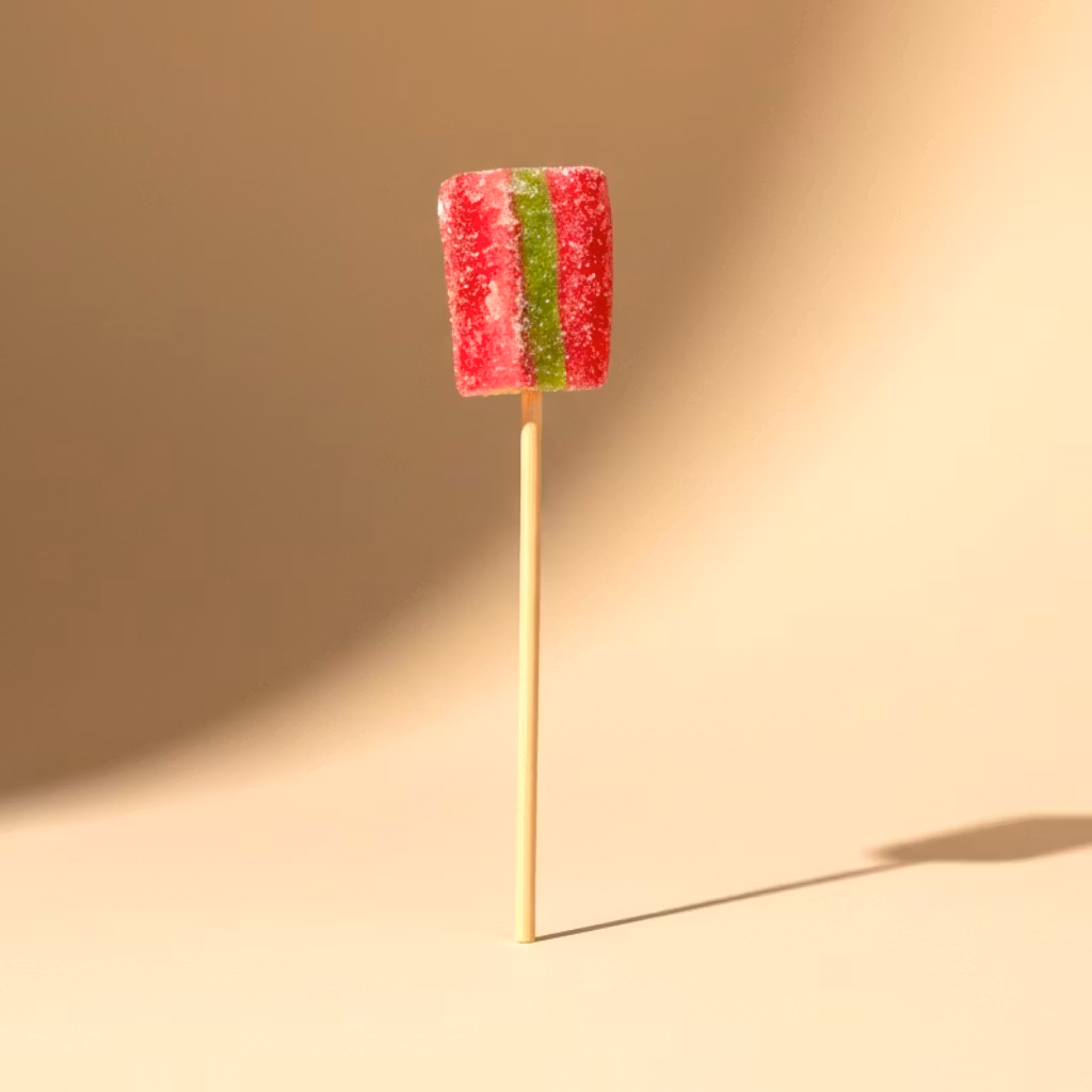 En härligt söt jordgubbssmak nu klädd i surt. Sockerklubban är försedd med cellofan.