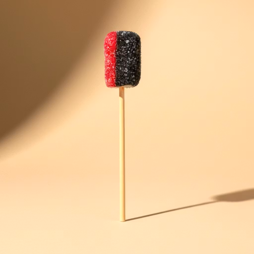 Kombinationen av sött och salt finner ni i vår hallon/salt-klubba. Sockerklubban är försedd med cellofan.